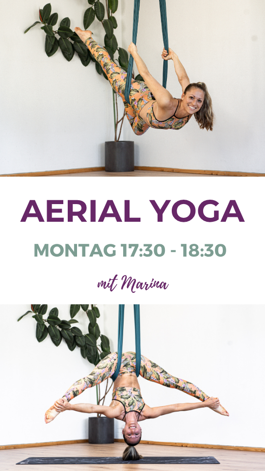 - Aerial Yoga für Jugendliche & Erwachsene: Hier geht es in die Tiefe! Wir fließen dynamisch von Haltung zu Haltung und nutzen das Tuch für Stärkung, Dehnung und Balance. Du wirst überrascht sein, wie du mit der Unterstützung des Tuches neue Haltungen erobern kannst und am Ende der Stunde eine intensive und schwebende Entspannung erlebst.